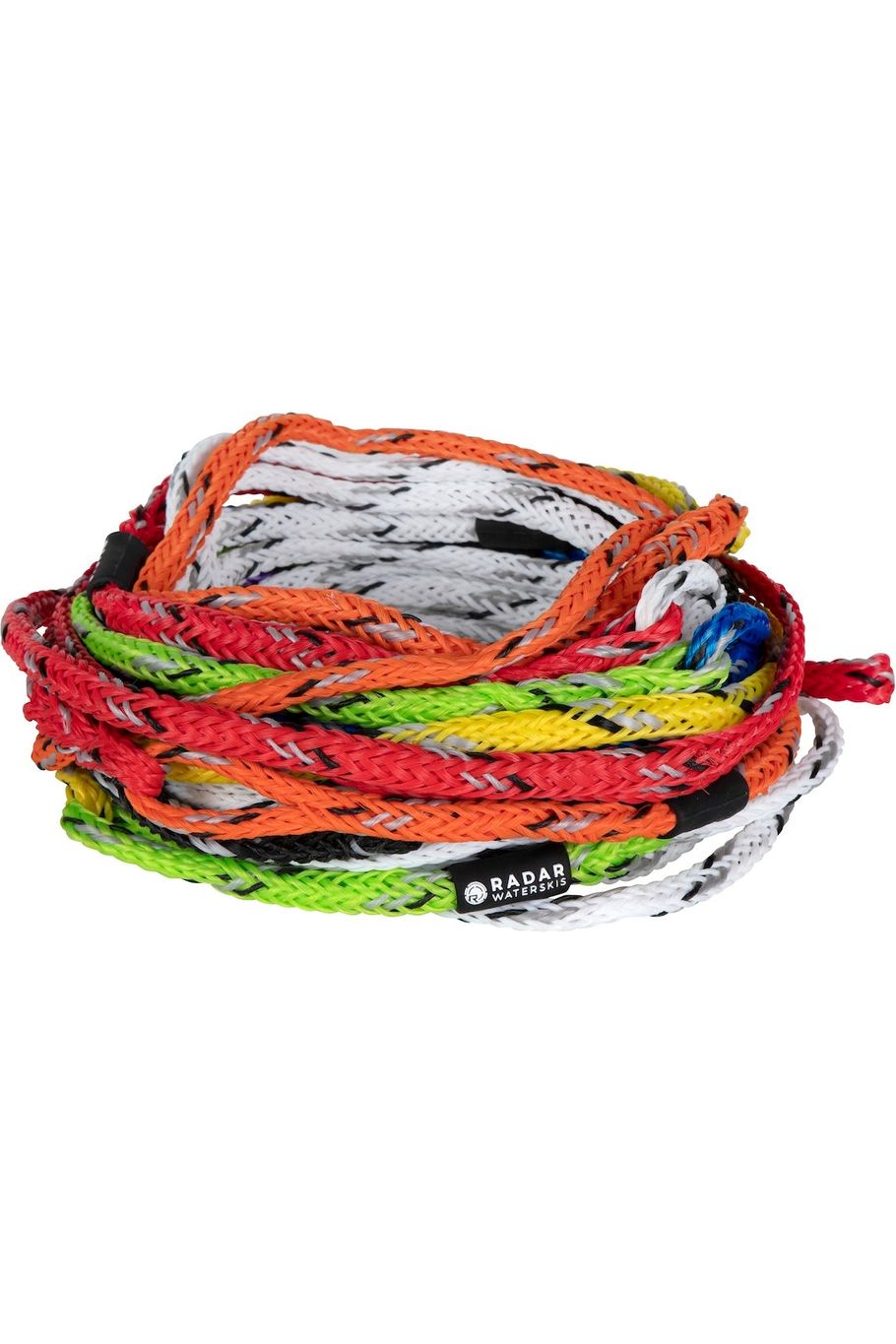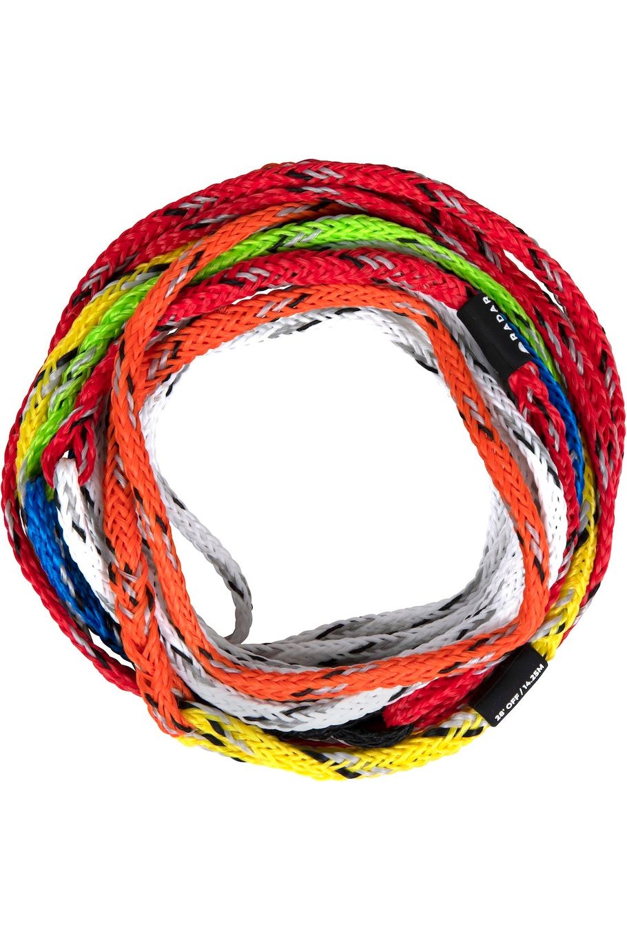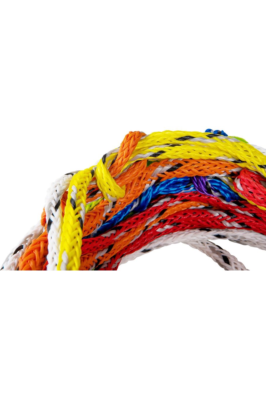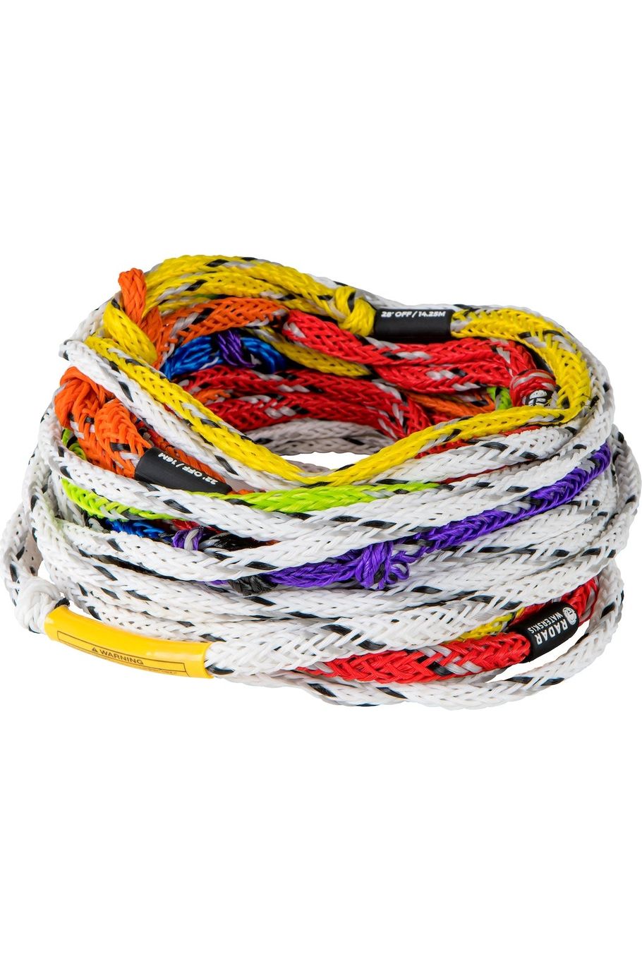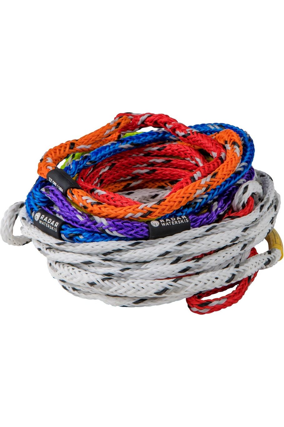 - The Traditional Loops - is what you see more often, where the sections of rope are looped into each other connecting the rope together. With this system it is important to make sure you put the correct loop on the pylon (ex. if you are shortening to yellow/14.25m/28off you need to make sure the yellow is connected to the pylon and not the orange part that connects to the yellow. While there is absolutely nothing wrong with this type of rope it's just important to make sure that it is connected to the pylon properly to avoid injury.